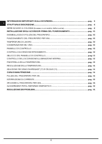 3 I MANUALE DI ISTRUZIONI FRIGORIFERO PER VINI Questo manuale contiene informazioni importanti s ulla sicurezza e sulle istruzioni di installazione degli apparecchi. Leggete con attenzione prima dell’uso e seguite tutte le informazioni di sicurezza e le istruzioni. Per abituarsi alle funzionalità de...